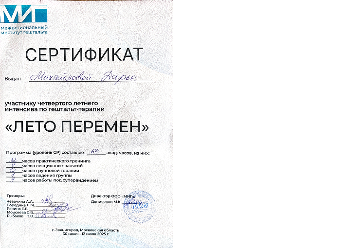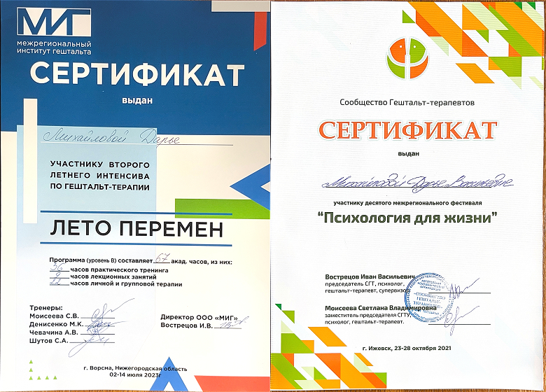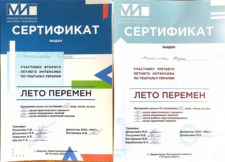 На сегодняшний день я заканчиваю обучение на 2 ступени программы (4-й год обучения) в Межрегиональном институте Гештальта, а также прохожу специализацию "Психосамотические аспекты женского здоровья".