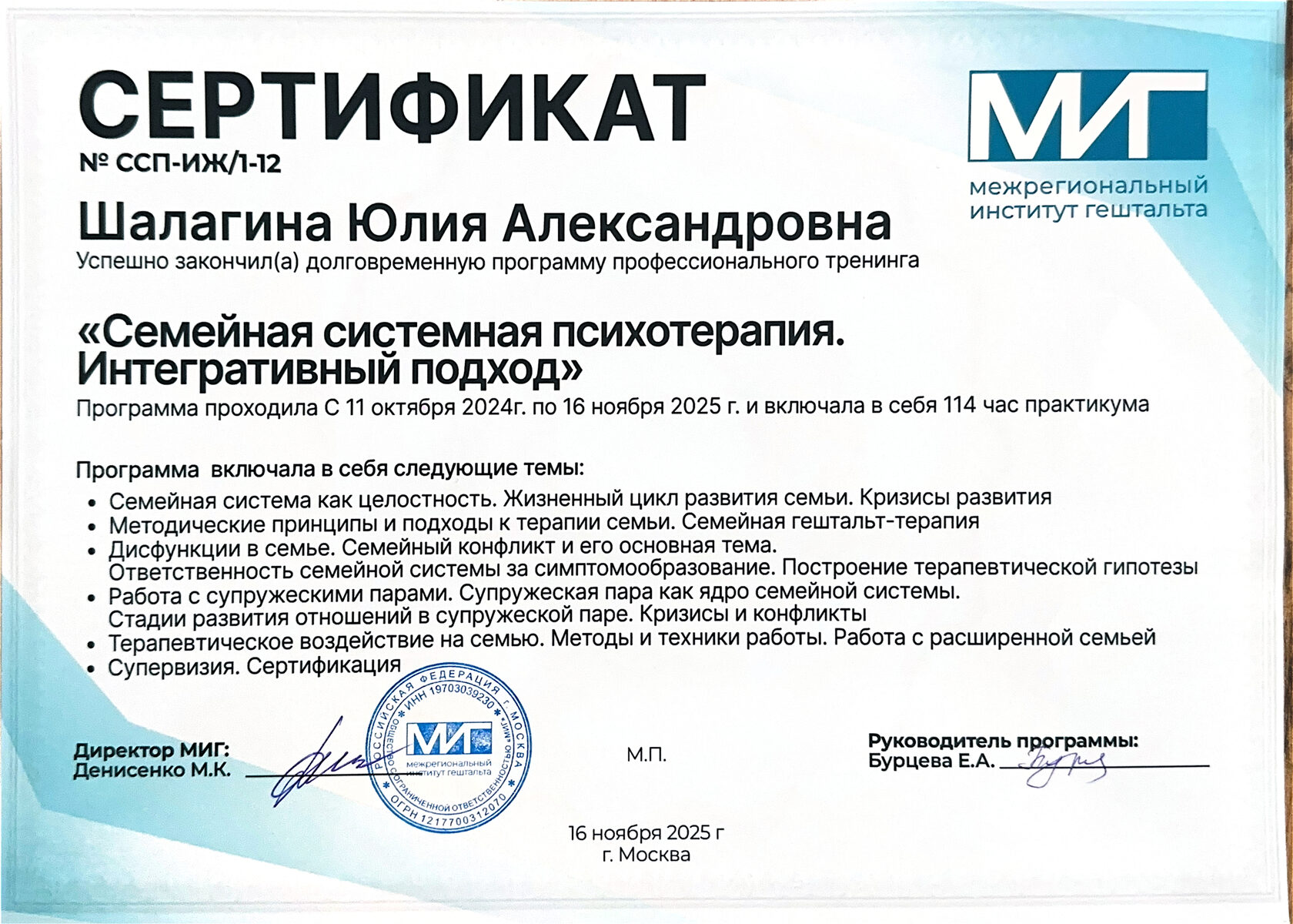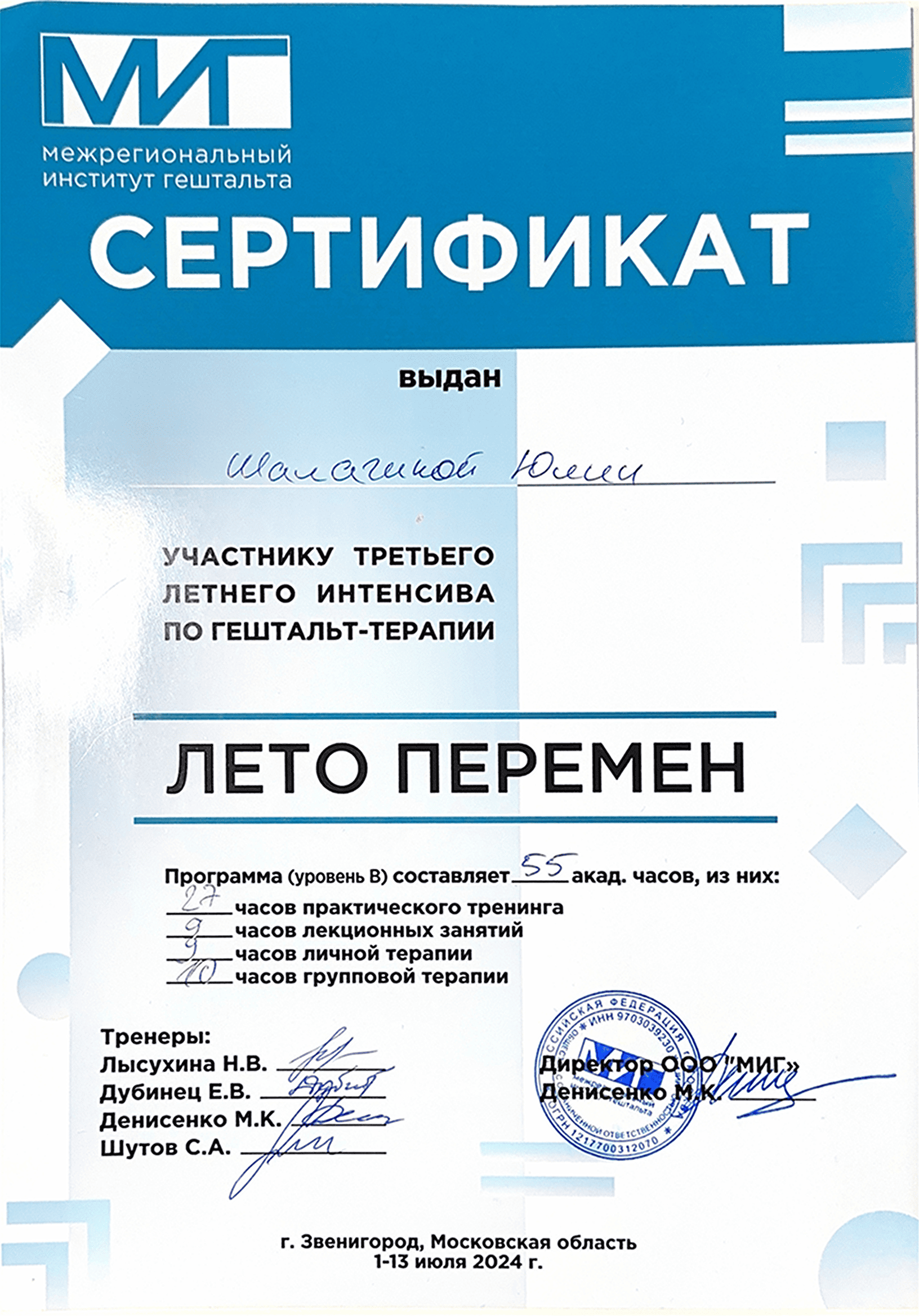 Являюсь участником ежегодных психологических конференций и интенсивов, проводимых Межрегиональным Институтом Гештальта